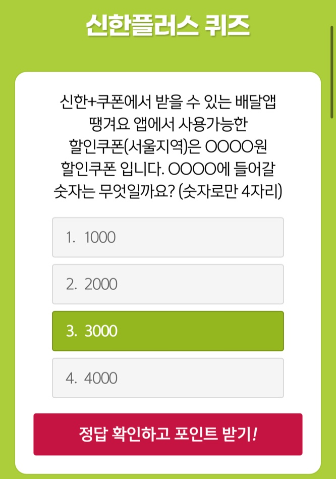 신한+쿠폰에서 받을 수 있는 배달앱 땡겨요 앱에서 사용가능한 할인쿠폰(서울지역)은 OOOO원 할인쿠폰 입니다. OOOO에 들어갈 숫자는 무엇일까요? (숫자로만 4자리)