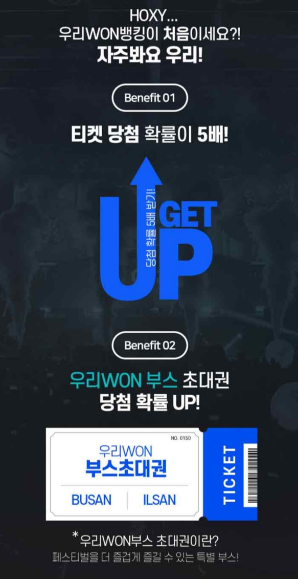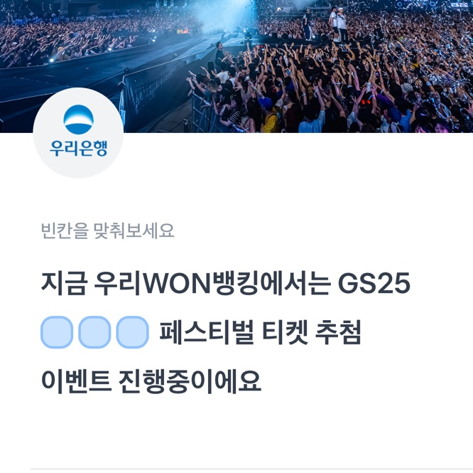 지금 우리WON뱅킹에서는 GS25 OOO페스티벌 티켓 추첨 이벤트 진행중이에요