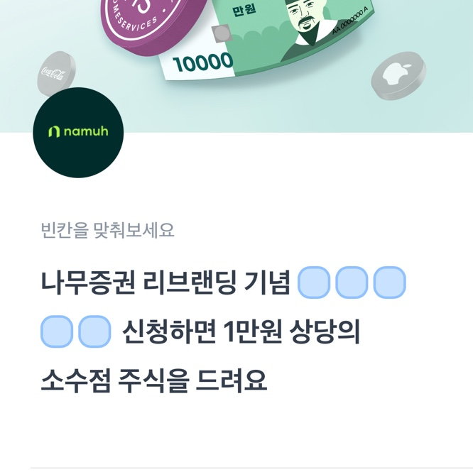나무증권 리브랜딩 기념 OOOOO 신청하면 1만원 상당의 소수점 주식을 드려요