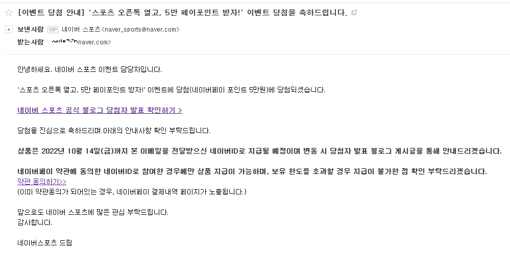 '스포츠 오픈톡 열고, 5만 페이포인트 받자!' 이벤트에 당첨(네이버페이 포인트 5만원)에 당첨되셨습니다.