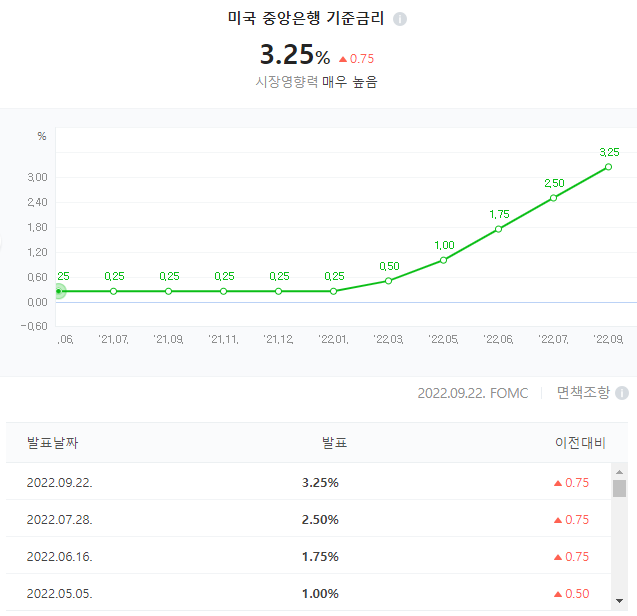 FOMC 즉 미국 중앙은행이 3번 연속 자이언트 스텝(0.75%p 인상)을 하였다.