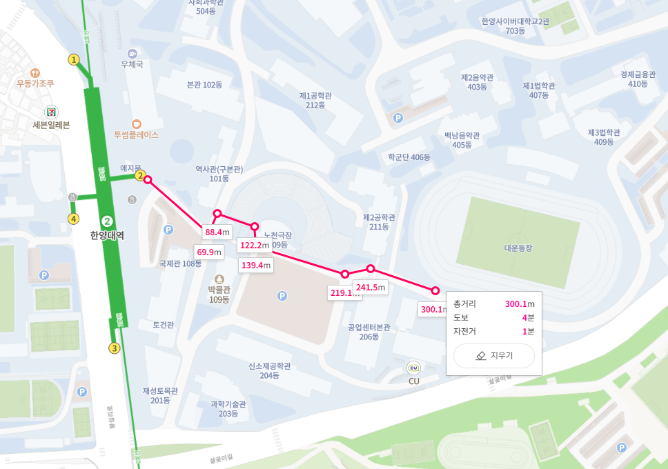 한양대역 2번 출구에서 육상트랙까지 거리는 300m입니다.