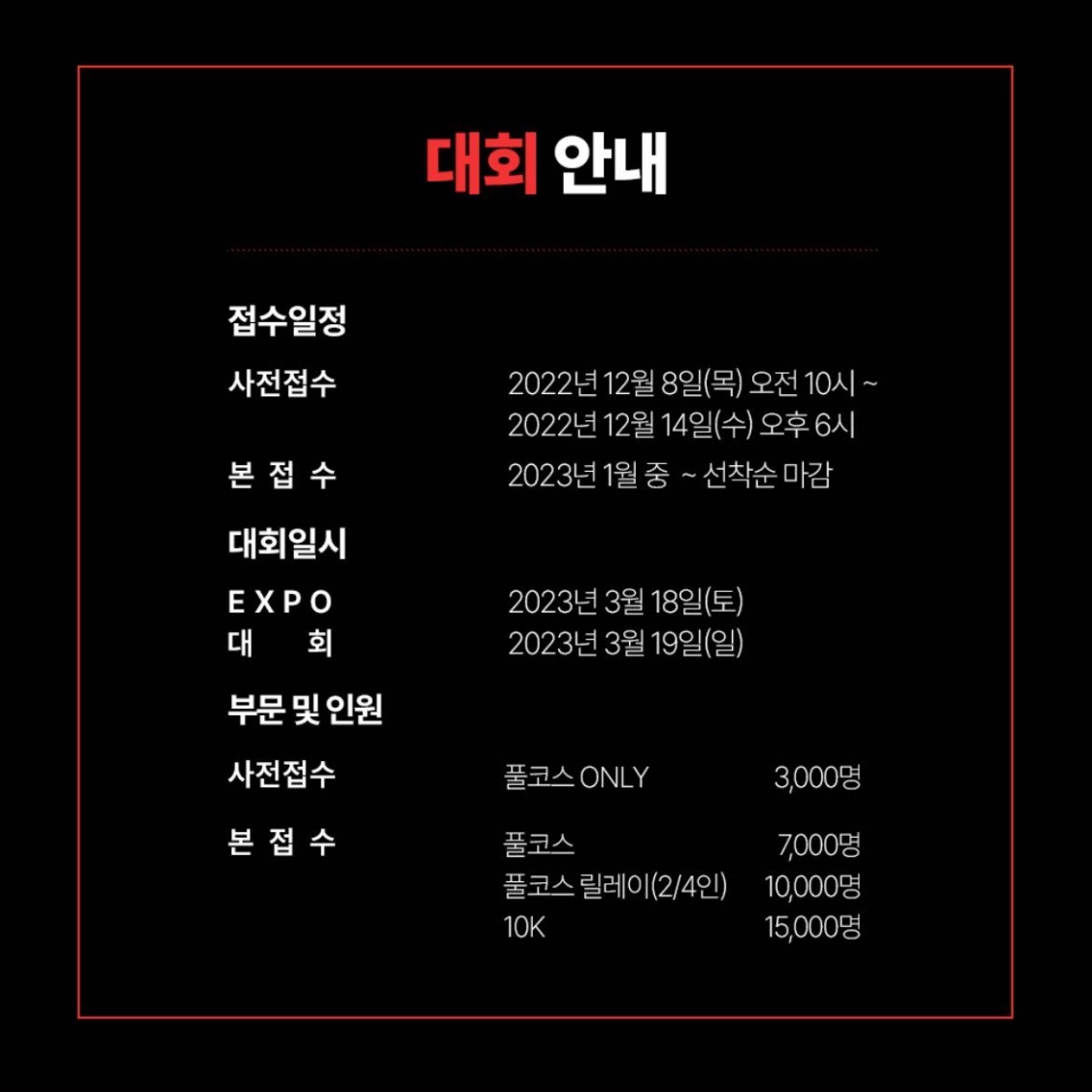 | 서울마라톤 얼리버드 2023 신청자수 | 경쟁률 | Early Bird Open 2023 (1) | 2022.12.09 |