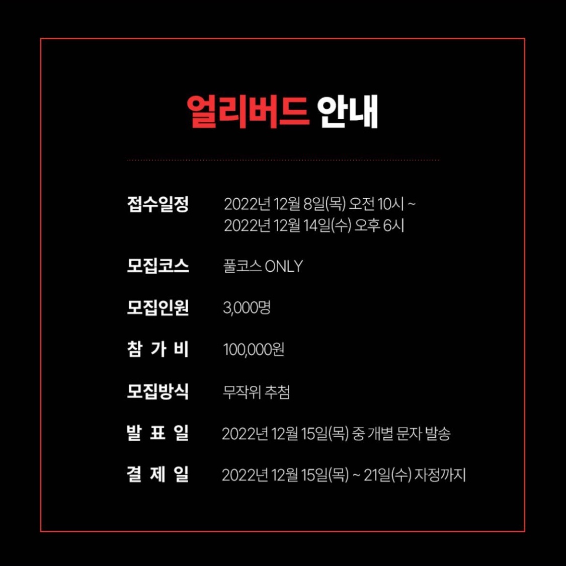 접수일정 : 2022년 12월 8일(목) 오전 10시 ~ 2022년 12월 14일(수) 오후 6시