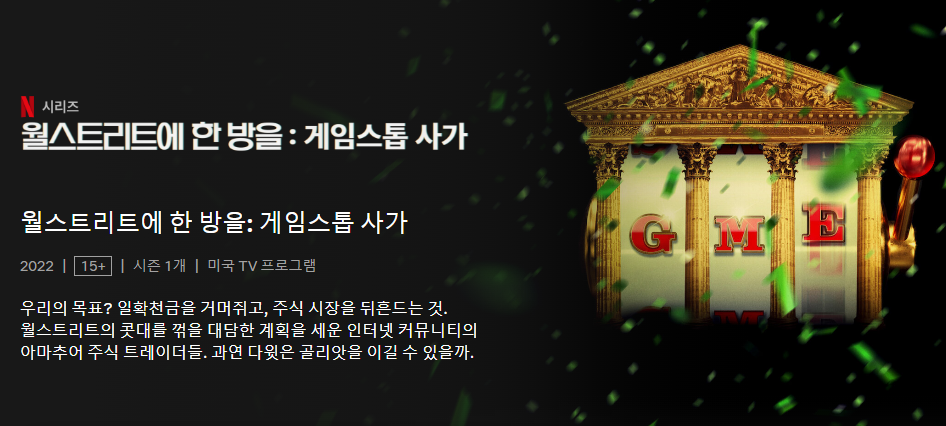 이번 넷플릭스 다큐멘터리는 2021년 1월, 레딧을 중심으로 한 개인 투자자들이 대형 헤지펀드의 공매도 포지션에 대항해 게임스탑 주식을 대량으로 매수하며 주가를 폭등시킨 사건을 다룬 다큐입니다..