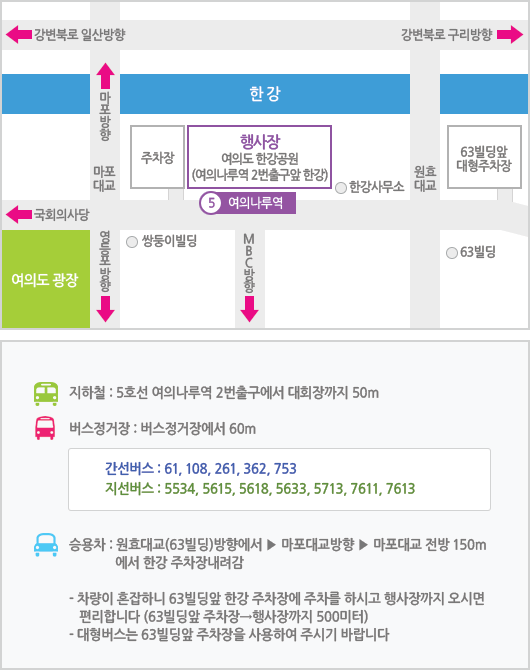 대중교통 이용을 추천드리지만 만약 차량을 가지고 오신다면 63빌딩 앞 한강 주차장에 주차를 하시고 행사장까지 오시면 편리하다고 합니다.(63빌딩앞 주차장 -> 행사장까지 500미터)