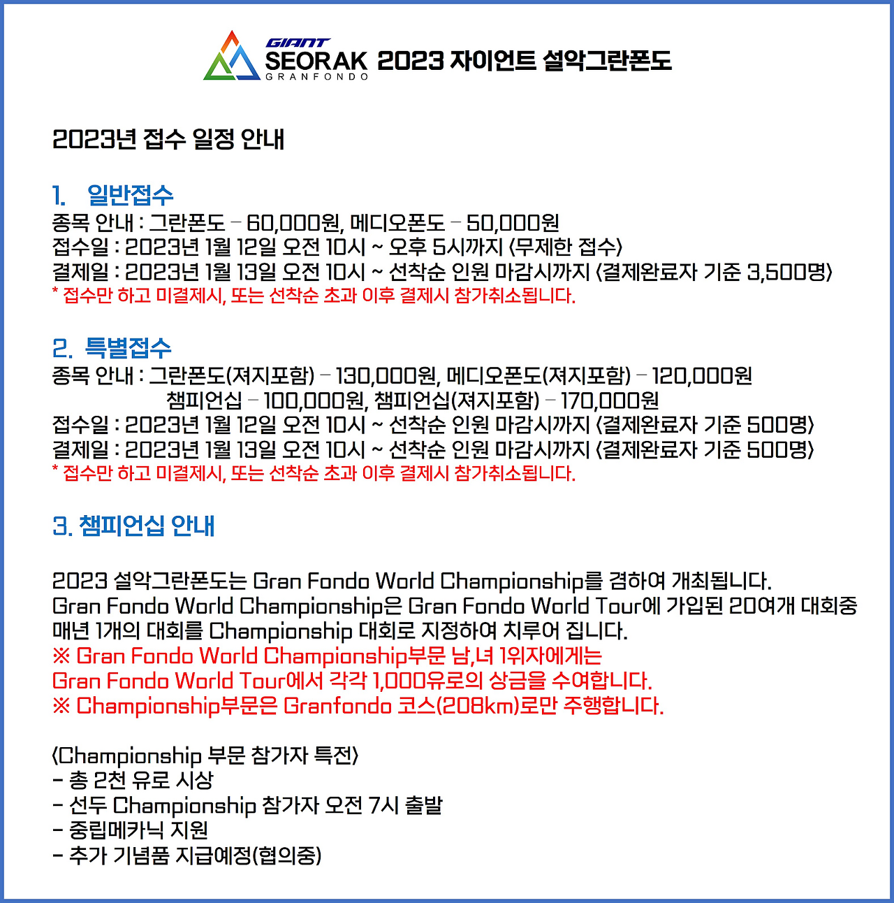 접수기간 1. 일반접수 종목 안내 : 그란폰도 – 60,000원, 메디오폰도 – 50,000원 접수일 : 2023년 1월 12일 오전 10시 ~ 오후 5시까지 <무제한 접수> 결제일 : 2023년 1월 13일 오전 10시 ~ 선착순 인원 마