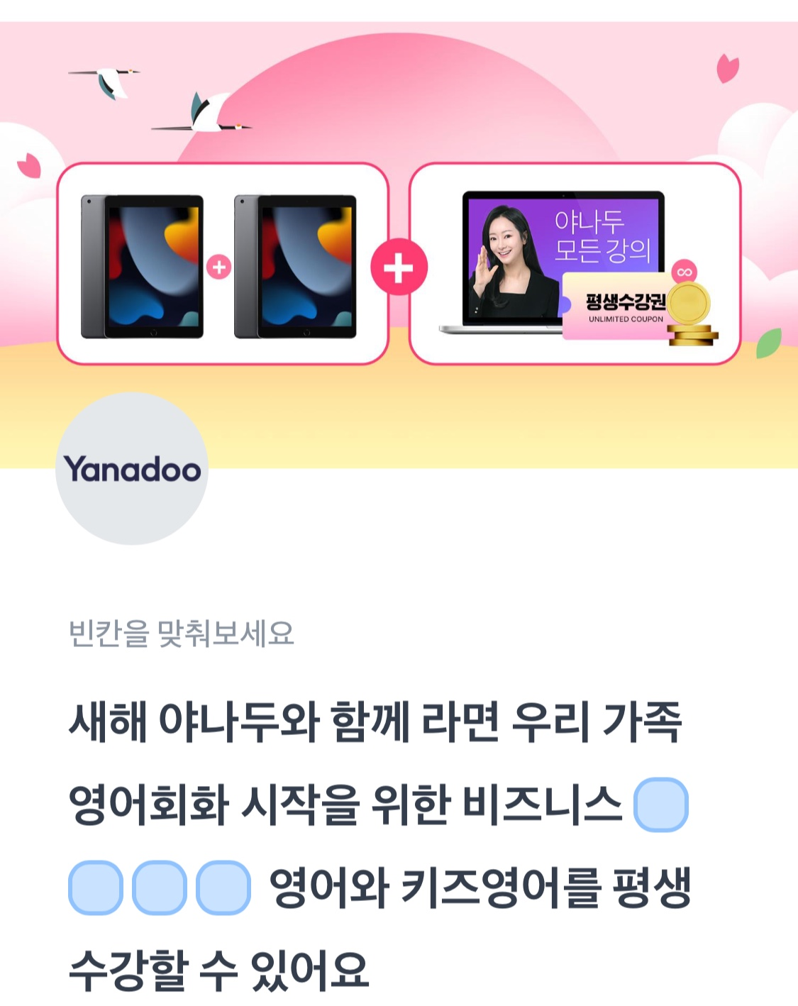 새해 야나두와 함께 라면 우리 가족 영어회화 시작을 위한 비즈니스 OOOO 영어와 키즈영어를 평생 수강할 수 있어요