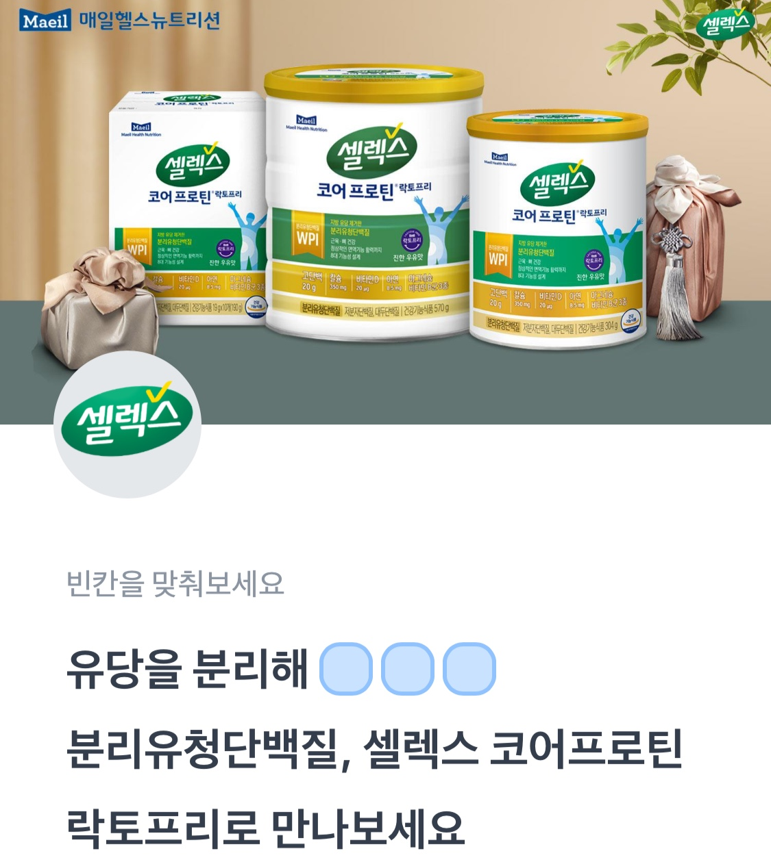 유당을 분리해 OOO 분리유청단백질, 셀렉스 코어프로틴 락토프리로 만나보세요.