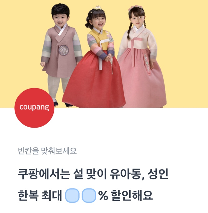 쿠팡에서는 설 맞이 유아동, 성인 한복 최대 OO% 할인해요.