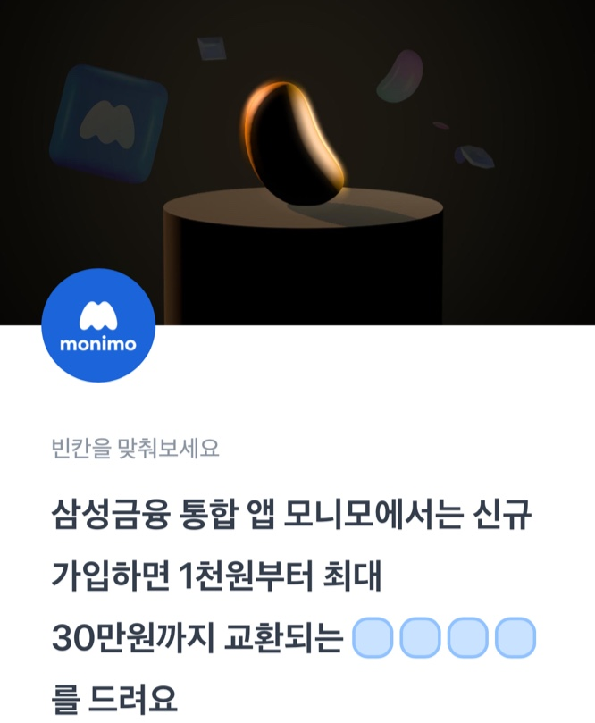 삼성금융 통합 앱 모니모에서는 신규 가입하면 1천원부터 최대 30만원까지 교환되는 OOOO를 드려요