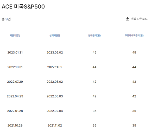 ACE 미국S&P500 1주당 분배금액은 45원입니다.