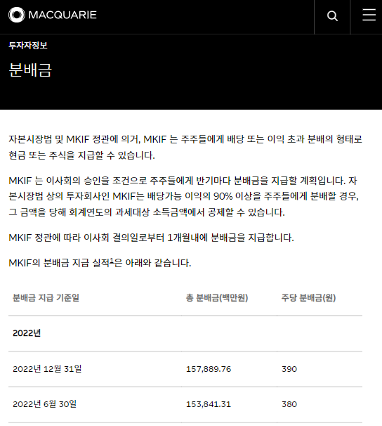 투자자정보 | 분배금 | 맥쿼리한국인프라투융자회사