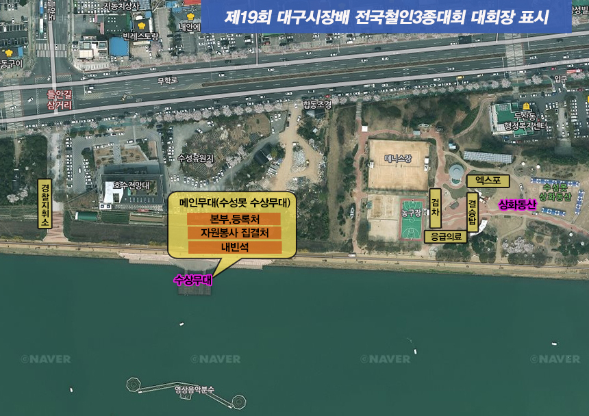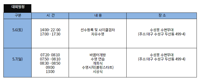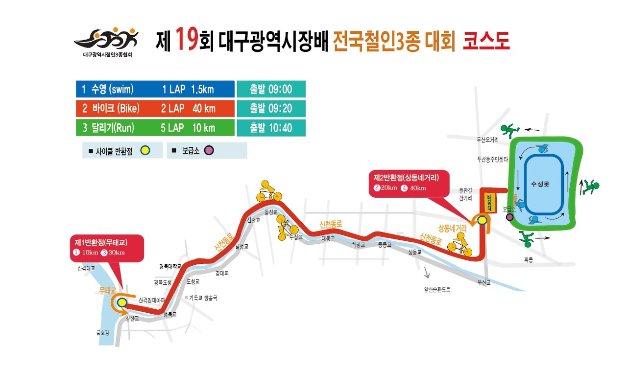 | 후원 | 대한철인3종협회, 대구광역시청, 수성구청, 대구지방경찰청, 수성경찰서, 수성소방서 |