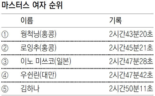 마스터즈 여자부에서는 홍콩선수인 Wong Cheuk Ning 웡 척닝(홍콩) 선수가 2시간 43분 19초로 우승하였습니다.