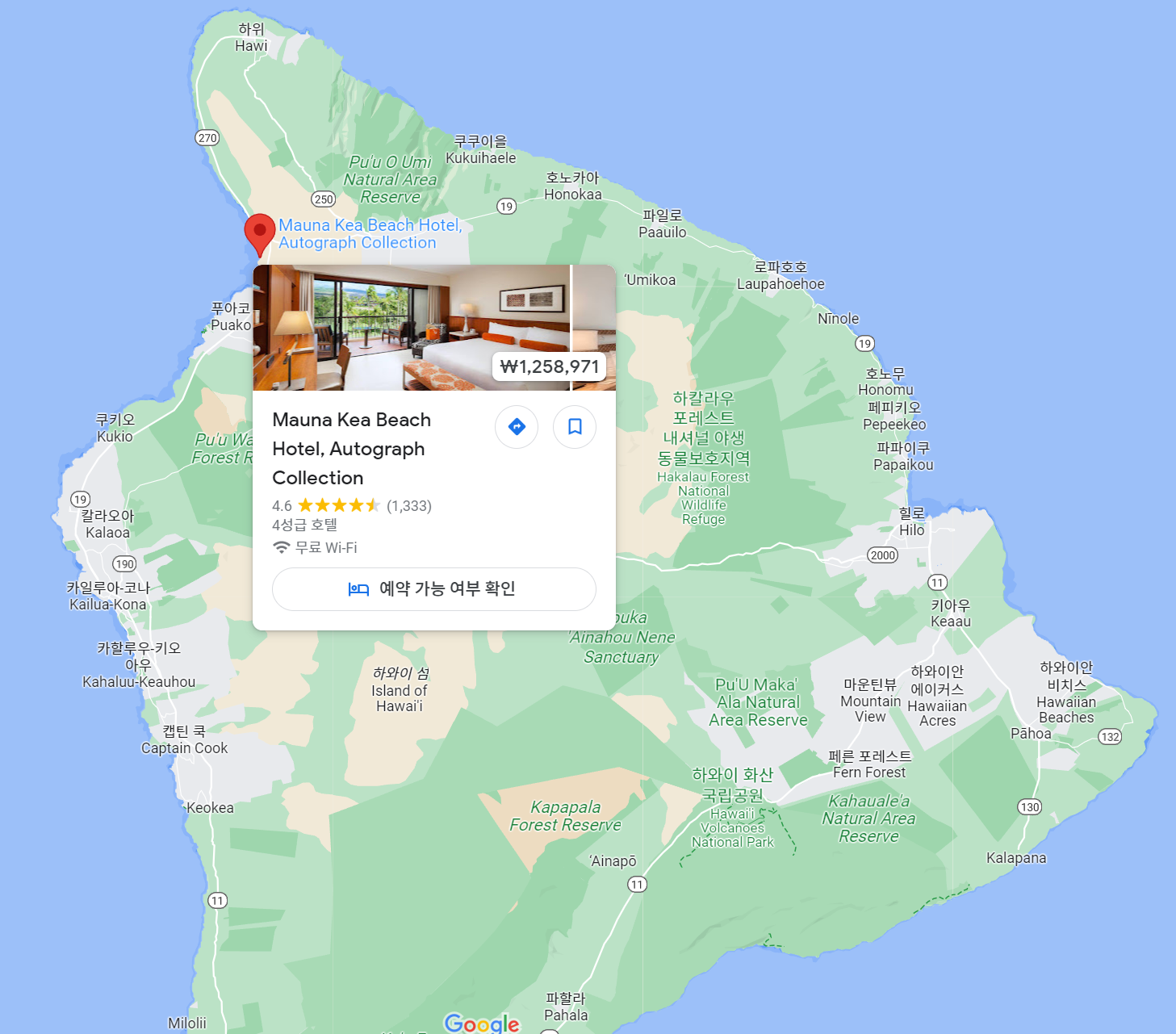 이 리조트는 유명한 마우나 케아 및 마우나 로아 화산, 유서 깊은 카일루아-코나 마을, 여러 세계적 수준의 골프 코스를 포함하여 빅 아일랜드의 다양한 관광 명소와 활동에 가깝습니다.