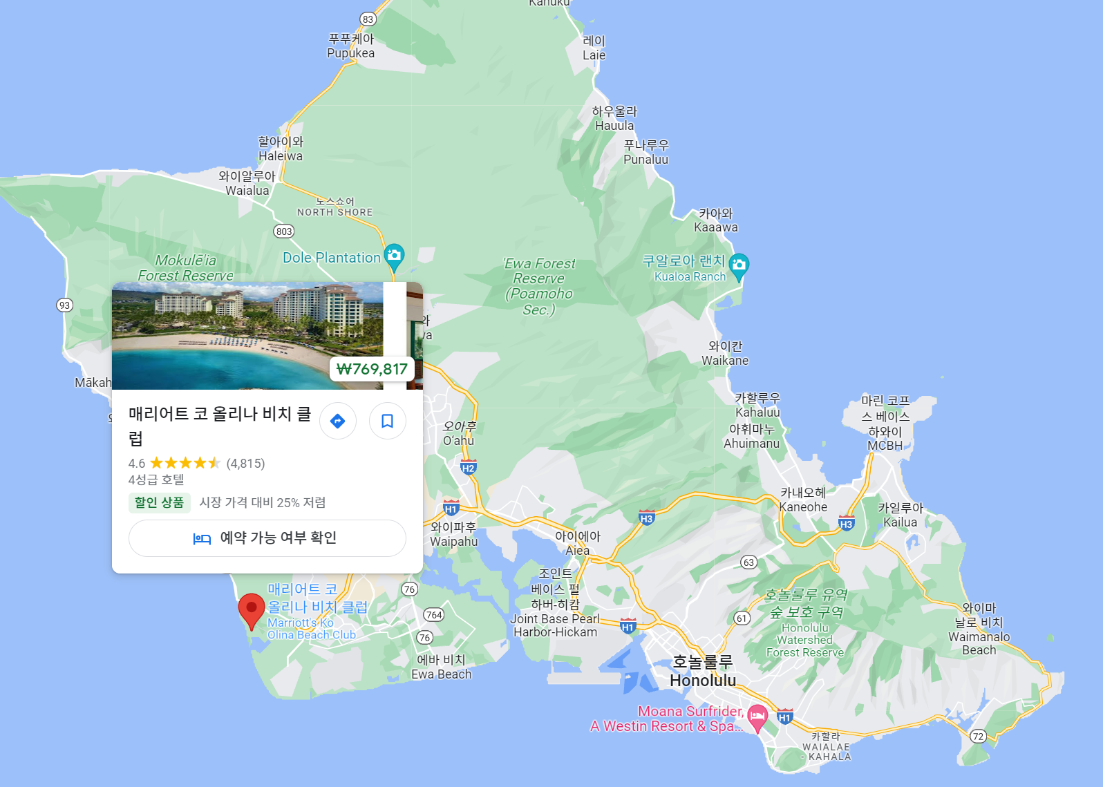 세계 1등 호텔 체인 메리어트 그룹은 당연히 하와이에도 많은 호텔이 영업중에 있습니다.
