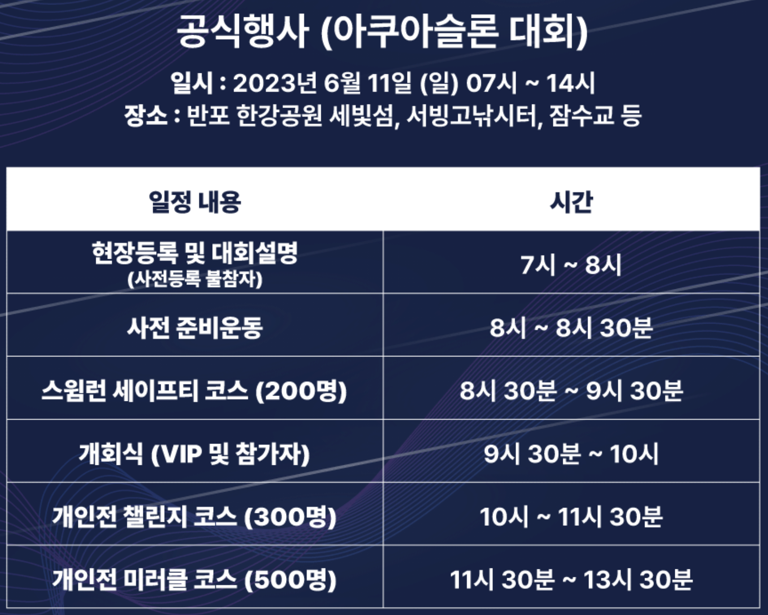 | 대회명 | 2023 한강 르네상스 페스티벌 아쿠아슬론 대회 |