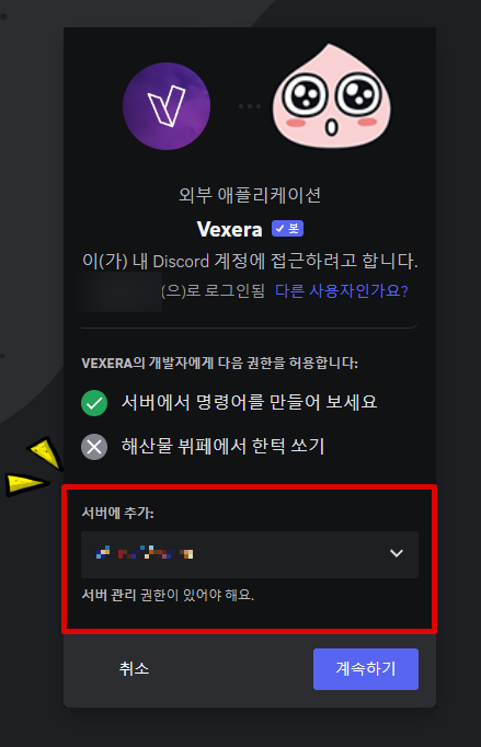 나의 디스코드 계정에 Vexera 접근권한을 설정해주어야 한다.