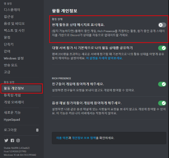 3. 활동 개인정보 설정화면 중 맨위 "현재 활동을 상태 메시지로 표시해요." 비 활성화 [On -> Off]