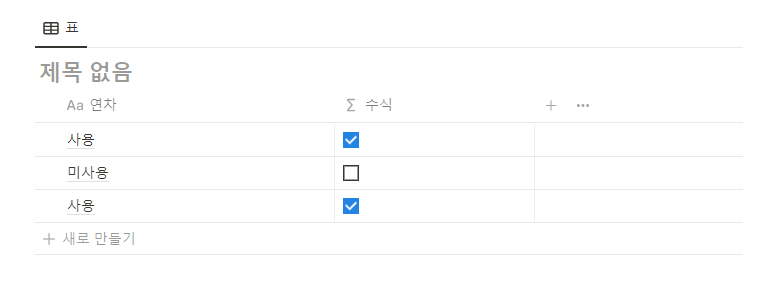 연차 컬럼값에 대해 "사용" 이라는 데이터가 있는 경우에만 수식 컬럼에 체크박스가 체크되어 있습니다.