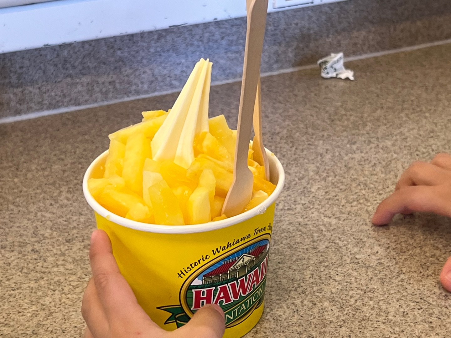 - 맛: 상큼한 파인애플 맛이 진하게 느껴지는 소프트 아이스크림이에요. 비건 친화적이라 유제품 알레르기 있는 분들도 OK! 저는 기본으로 먹었는데, 신선한 파인애플 조각 토핑을 추가하면 더 맛있다고 하더라고요. 뜨거운 하와이 날씨에 딱 맞는 시원함이었어요.