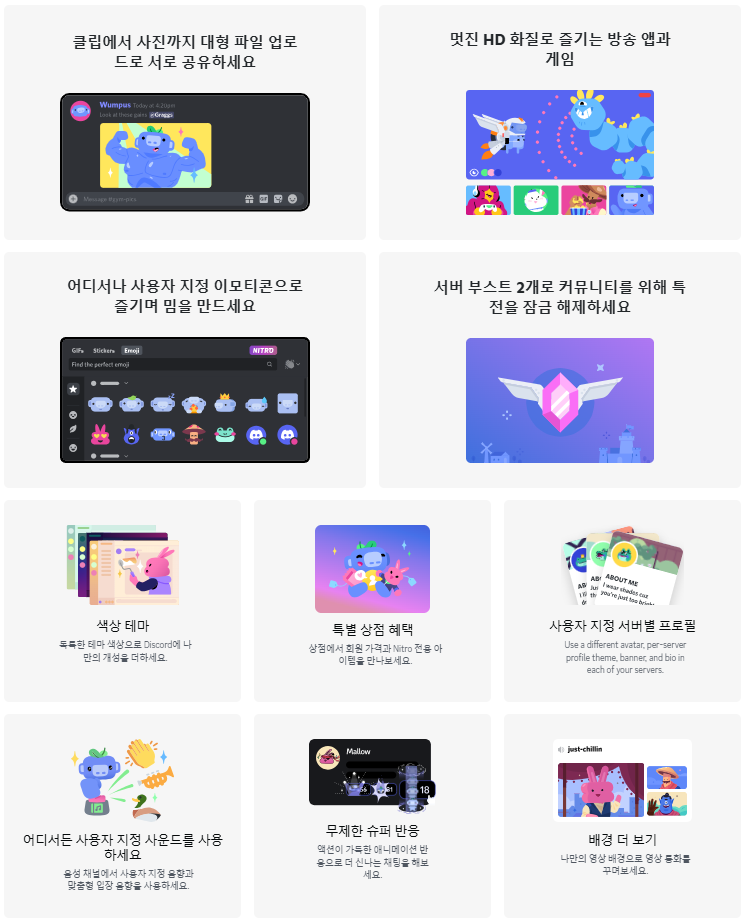 - 개인화 옵션: 애니메이션 아바타, 프로필 배너, 테마 설정으로 개성을 뽐낼 수 있음.