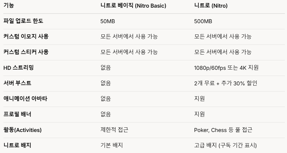 디스코드 니트로의 두 요금제는 제공하는 기능에서 차이가 있습니다. 아래 표로 니트로 베이직와 니트로의 기능을 비교해 보겠습니다.