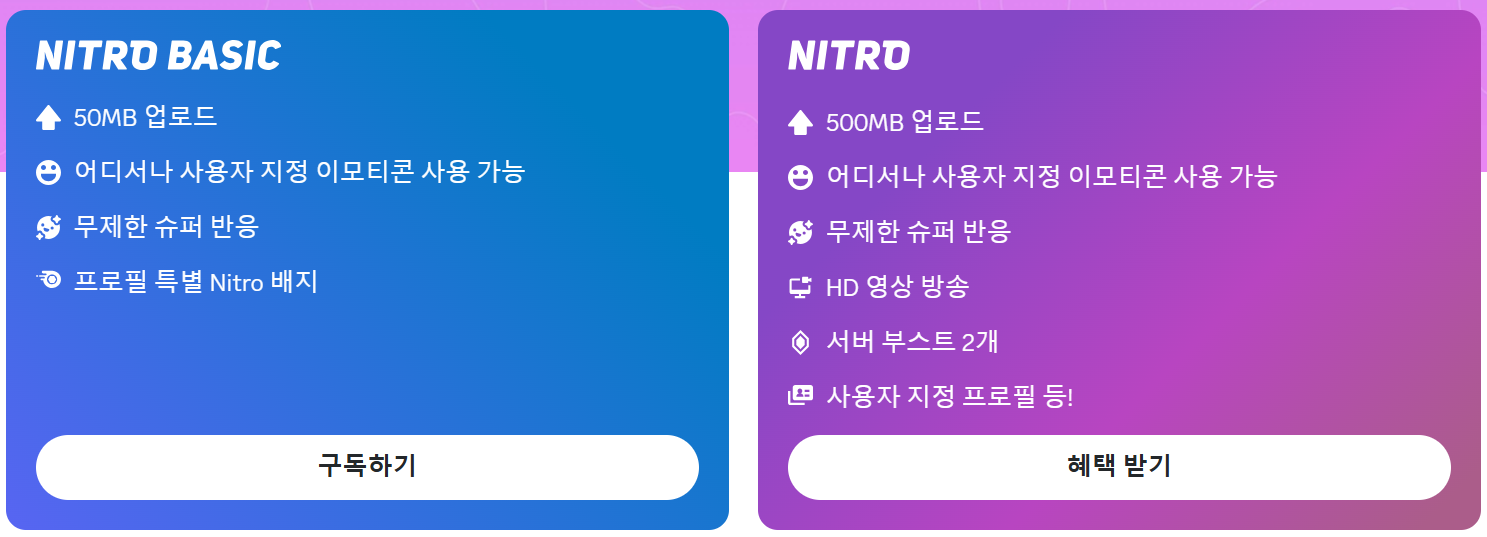 - 니트로 배지: 프로필에 구독자임을 표시하는 심플한 배지 제공.