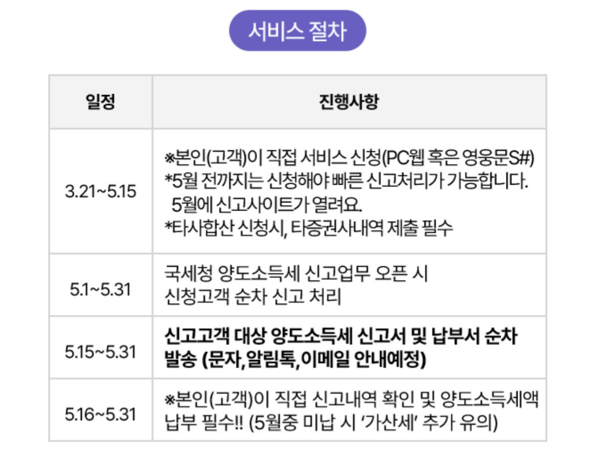 - 5.1 ~ 5.31 : 국세청 양도소득세 신고업무 오픈 시 신청 고객 순차 신고 처리