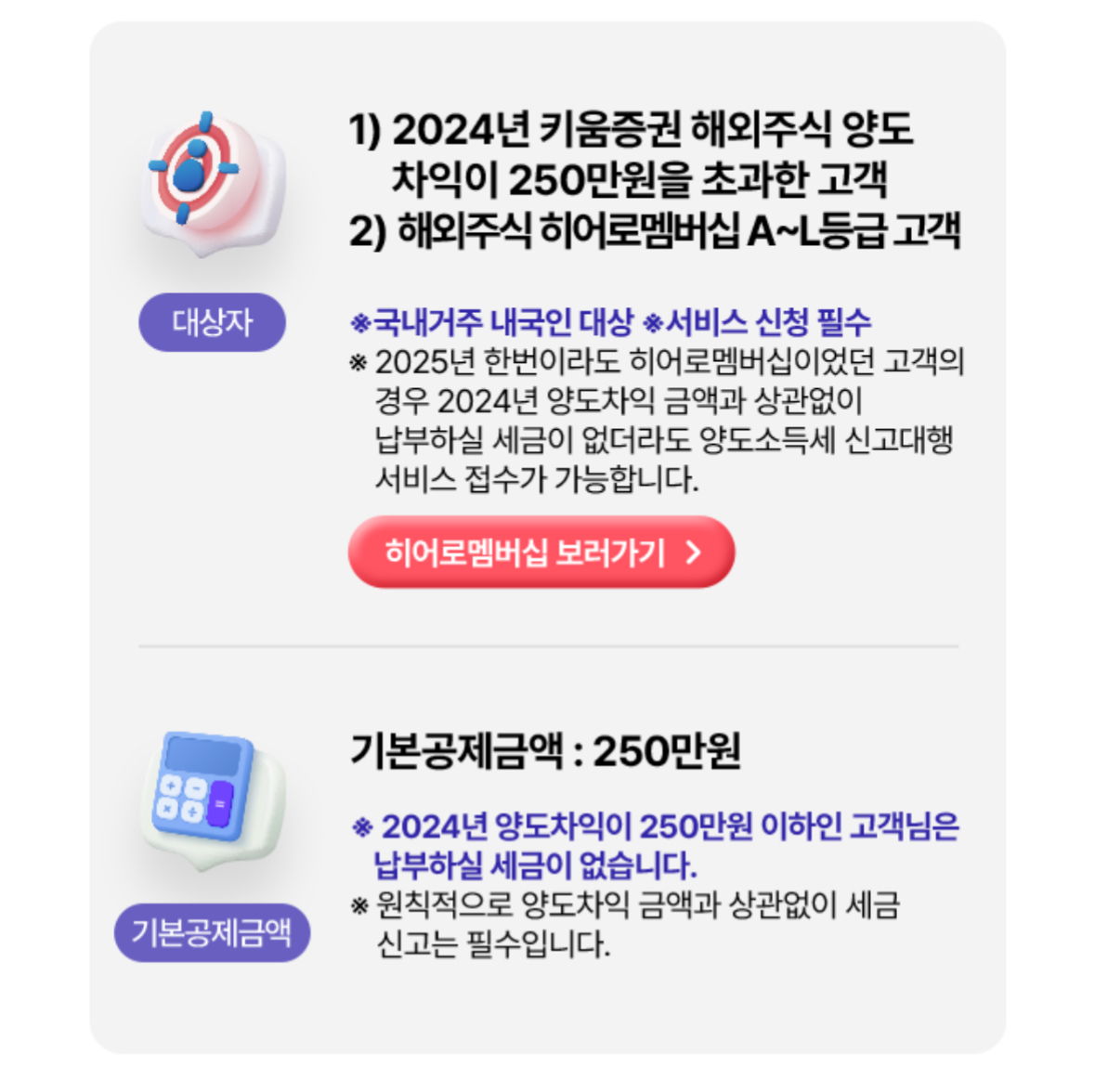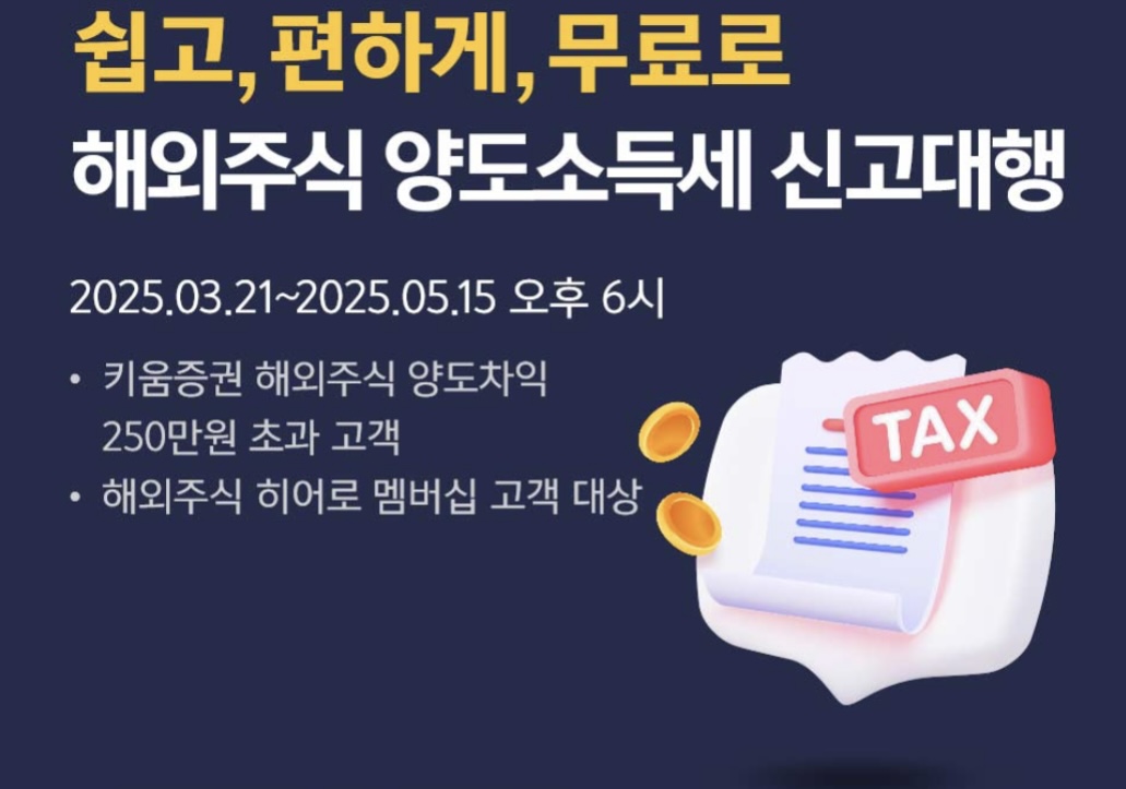 - 대상: 지난해 해외주식 양도소득액이 250만원을 초과했거나, 올해 '히어로멤버십'에 선정된 적 있는 키움증권 고객