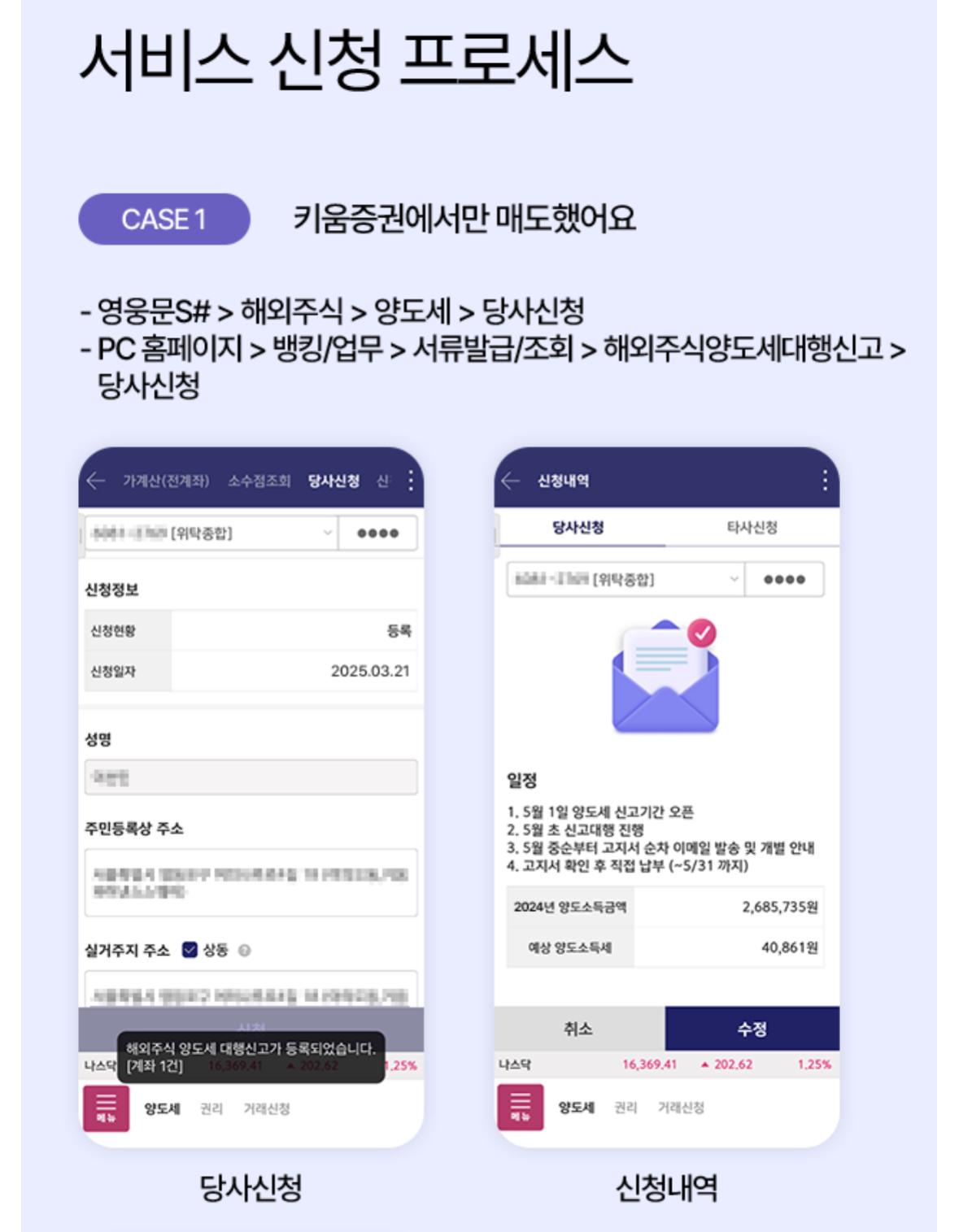 - PC 홈페이지 > 뱅킹/업무 > 서류발급/조회 > 해외주식양도세대행신고 > 당사신청