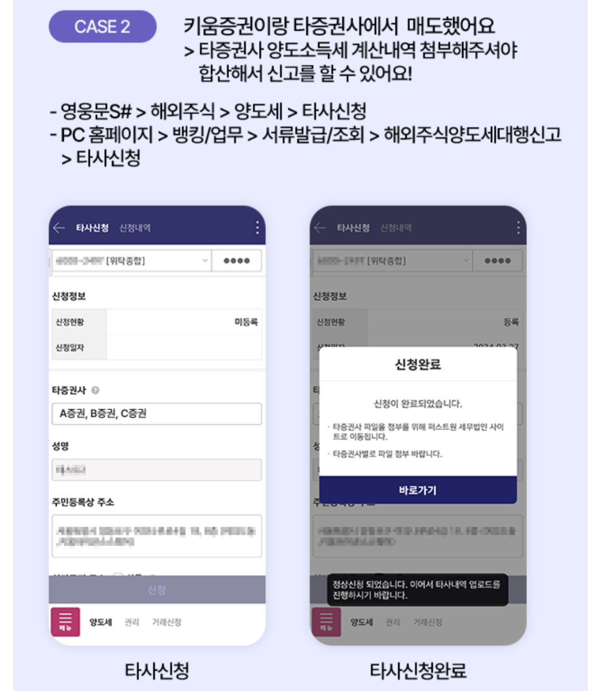 - PC 홈페이지 > 뱅킹/업무 > 서류발급/조회 > 해외주식양도세대행신고 > 타사신청