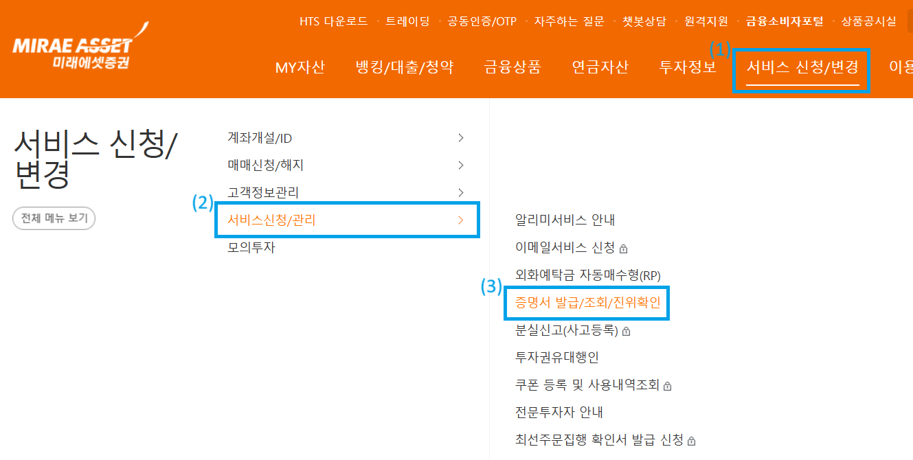 미래에셋증권 "증명서 발급" 화면으로 이동하는 법