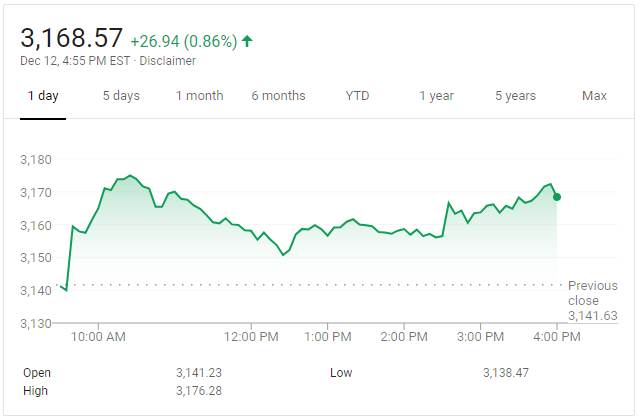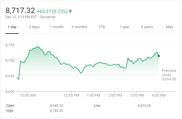 대형주 위주의 S&P(스탠다드앤푸어스) 500 지수는 26.94포인트(0.86%) 뛴 3168.57을 기록했다. 기술주 중심의 나스닥종합지수는 63.27포인트(0.73%) 상승한 8717.32에 마감했다. S&P 500과 나스닥 지수 둘 다 종가 기준으로도 사상최고치를 달성했다.