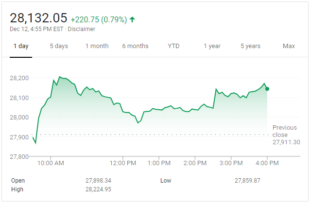 12일(현지시간) 뉴욕증시에서 3대 지수는 일제히 장중 최고 기록을 경신했다. 블루칩(우량주) 클럽인 다우존스산업평균지수는 220.75포인트(0.79%) 오른 2만8132.05에 거래를 마쳤다.