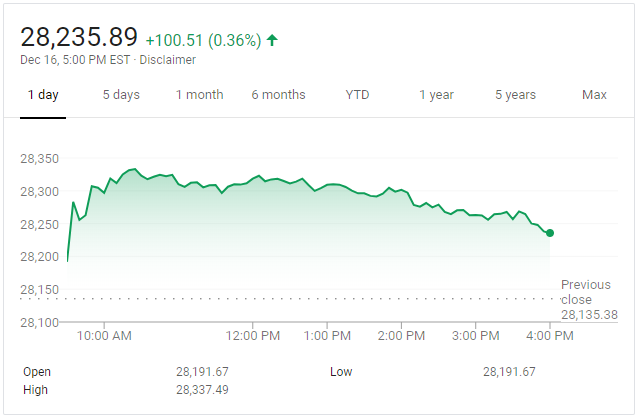 16일(현지시간) 뉴욕증시에서 블루칩(우량주) 클럽인 다우존스산업평균지수는 100.51포인트(0.36%) 오른 2만8235.89에 거래를 마쳤다.