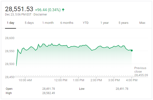 로이터통신에 따르면 이날 뉴욕증권거래소(NYSE)에서 다우존스 30 산업평균지수는 전거래일다 96.44포인트(0.34%) 상승한 28,551.53에 거래를 마쳤다. 스탠더드앤드푸어스(S&P) 500 지수는 2.79포인트(0.09%) 오른 3,224.01에, 기술주 중심의 나스닥 지수는 20.69포인트(0.23%) 상승한 8,945.65로 각각 장을 마감했다.
