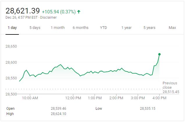 초대형 블루칩 30개로 구성된 다우존스30 산업평균지수는 105.94포인트(0.37%) 상승한 28,621.39에 거래를 마치면서 종전의 최고치 기록을 갈아치웠다.
