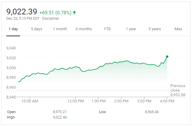 뉴욕증시에서 나스닥지수는 전 거래일보다 69.51포인트(0.78%) 오른 9,022.39에 거래를 마쳤다. 나스닥지수는 이날 오전 9,000선을 넘어선 뒤 꾸준히 상승 폭을 확대했다.