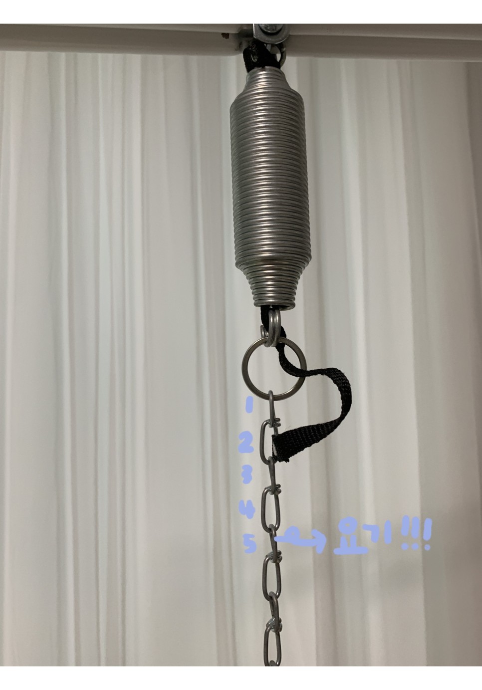높이 조절은 스프링에 연결할 체인 길이로 조절할 수 있습니다.