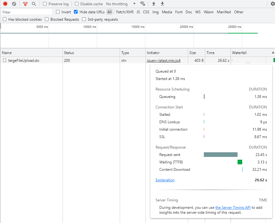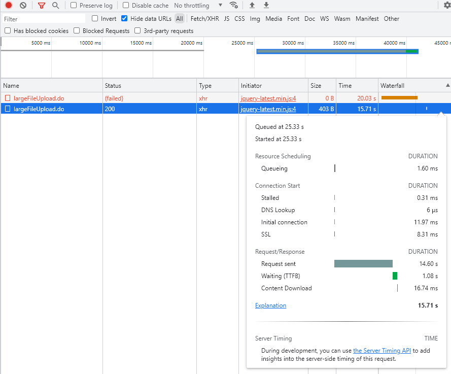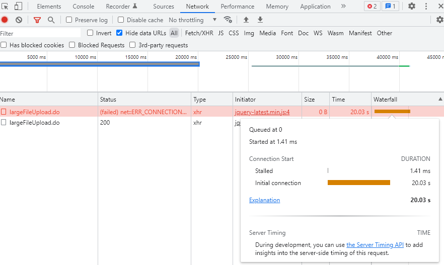200MB이상 파일 업로드 시 20초 경과되어도 오류 없이 성공됨